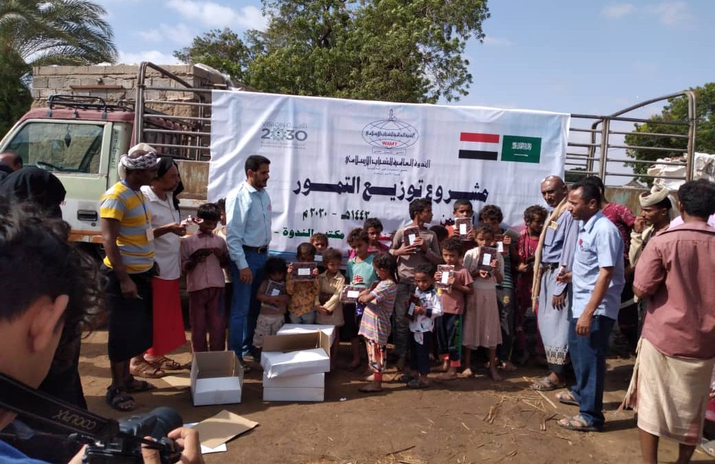 وتحدث مدير جمعية أبو موسى الأشعري اسماعيل الشرعبي انه تم توزيع ( 4 ) طن من التمور استفادت منه نحو 500 اسرة نازحة في ( 5 )مخيمات نزوح بمديريتي دار سعد والبريقة وهي قرية الفلاحين والبساتين وقرية الدمح والغربية في دار سعد ومنطقة الشعب في البريقة بدعم من الندوة العالمية للشباب الاسلامي – مكتب اليمن.